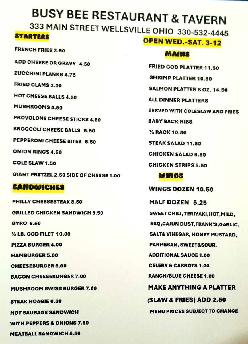 Welcome to Busy Bee Tavern & Restaurant, where delicious food meets a welcoming atmosphere! Located at 333 Main St, Wellsville, OH, this gem is a favorite among locals for its mouthwatering menu and warm hospitality.